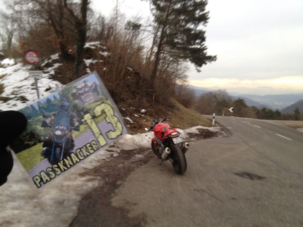 Oder mach' es doch ganz einfach so: nimm jemanden mit zum Pässeknacken. Die Begleitperson kann ja aktiv mit eigenem Töff mitfahren oder sich etwas passiver auf Deinem Monster für Krummbeinige chauffieren lassen. Aber Achtung: ab und zu sollte dann diese Person, welche das Poster ins Bild hält, auch von vorne und ohne Helm zu sehen sein. Denn da kenne ich einen der Admins, welcher mich da in der Vergangenheit ab und zu etwas gerügt hat. Aber die Vorteile liegen auf der Hand: