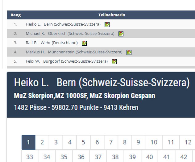 Es gibt noch einen zweiten Grund warum ich die Pässe nicht eintrage. 28000km bringt meine Ehe eh schon an den Rand des nicht mehr vorhanden seins. Würde ich meine Pässe eintragen, dann wäre der Ehrgeiz oder das Suchtpotential sicher viel zu groß. Ich vermute, die meisten der TOP 20 sind geschieden und Single. :roll: