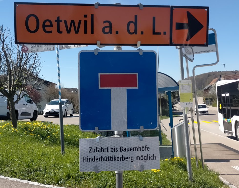 Die Durchfahrt von und nach Oetwil a.d.L. ist gesperrt. Von Hüttikon her ist die Zufahrt bis zu den Bauernhöfen, die sich ein paar 100m nach dem Punkt befinden, möglich.