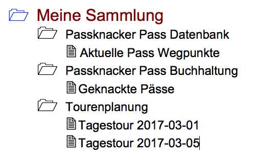 Diese Doppelspurigkeit ist beabsichtig, damit die Änderungen an den heruntergeladenen Passknacker Pass Wegpunkten sich nicht auf die Eigenen Pass Wegpunkte auswirken und umgekehrt. Die Eigenen Pass Wegpunkte bilden das Archiv, weil ich darin einige Infos einbaue, da sie über Jahre unverändert in BaseCamp erhalten bleiben. Für die heruntergelanden Pass Wegegpunkte lohnt sich der Aufwand nicht, da sie mit jeder Aktion Tourenplanung, Pass Buchhaltung usw. sich verändern können.