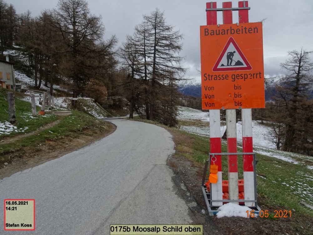 Von der anderen Seite in Törbel genauere Angaben über den Zeitraum (4.-28.5.2021), aber keine Information, ob die Strasse zu bestimmten Tageszeiten und am Wochenende befahrbar ist: